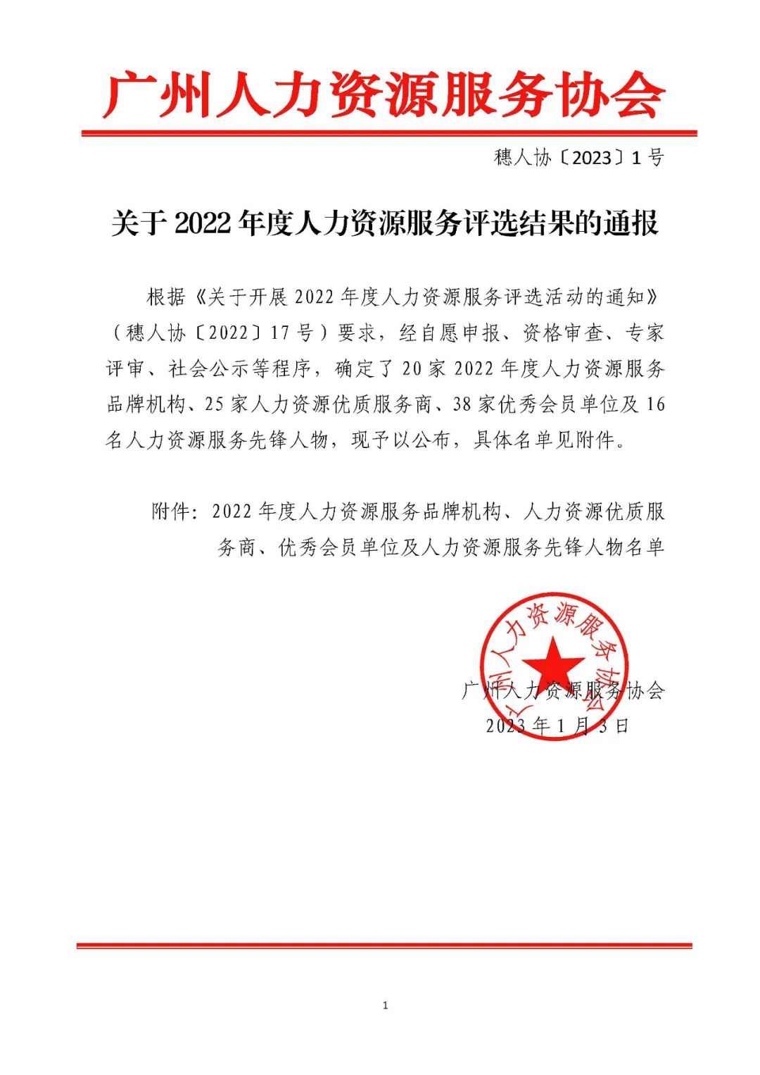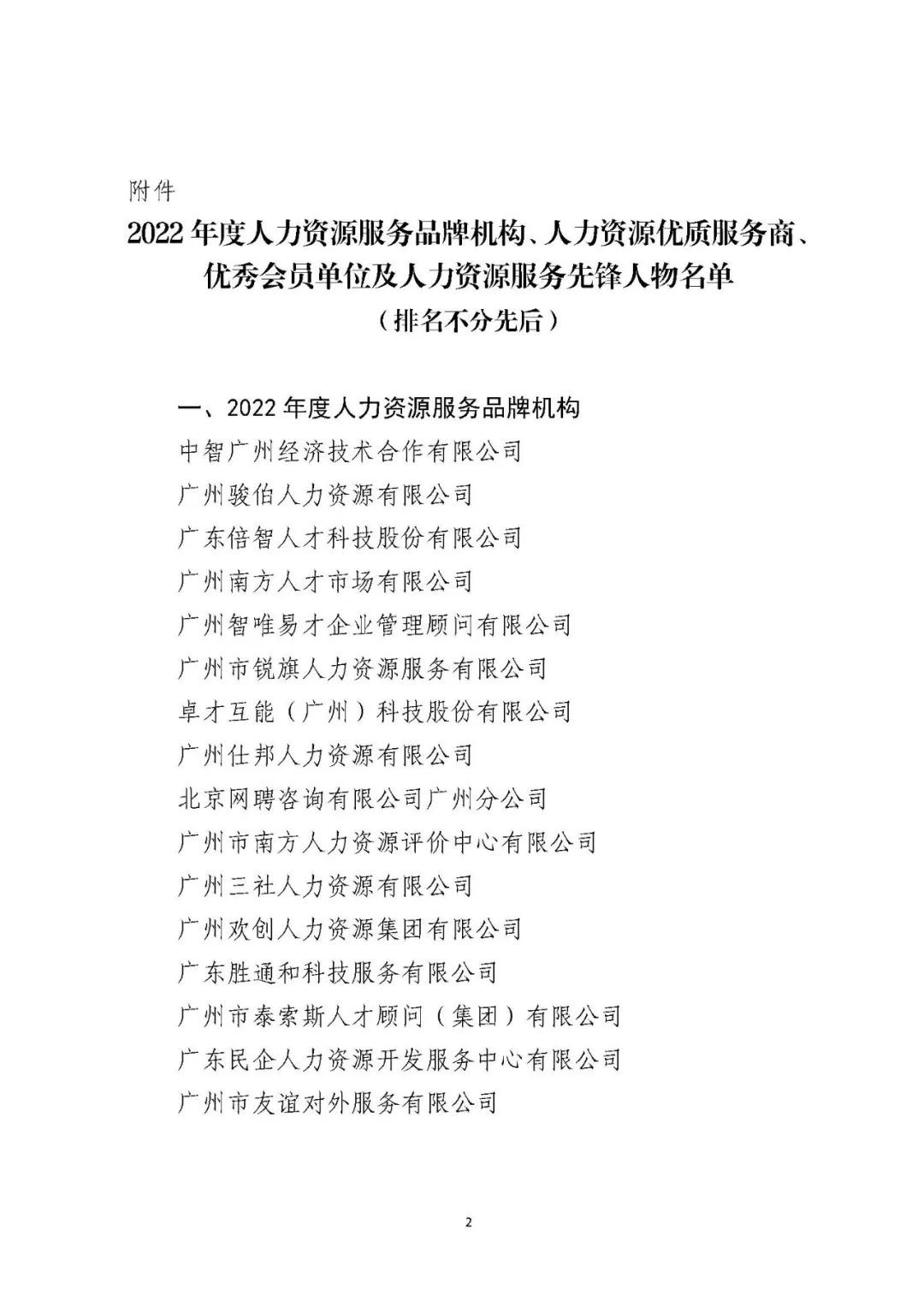 根据《关于开展2022年度人力资源服务评选活动的通知》(穗人协〔2022〕17号)要求,经自愿申报、资格审查、专家评审、社会公示等程序,确定了20家2022年度人力资源服务品牌机构、25家人力资源优质服务商、38家优秀会员单位及16名人力资源服务先锋人物,现予以公布,具体名单见附件。